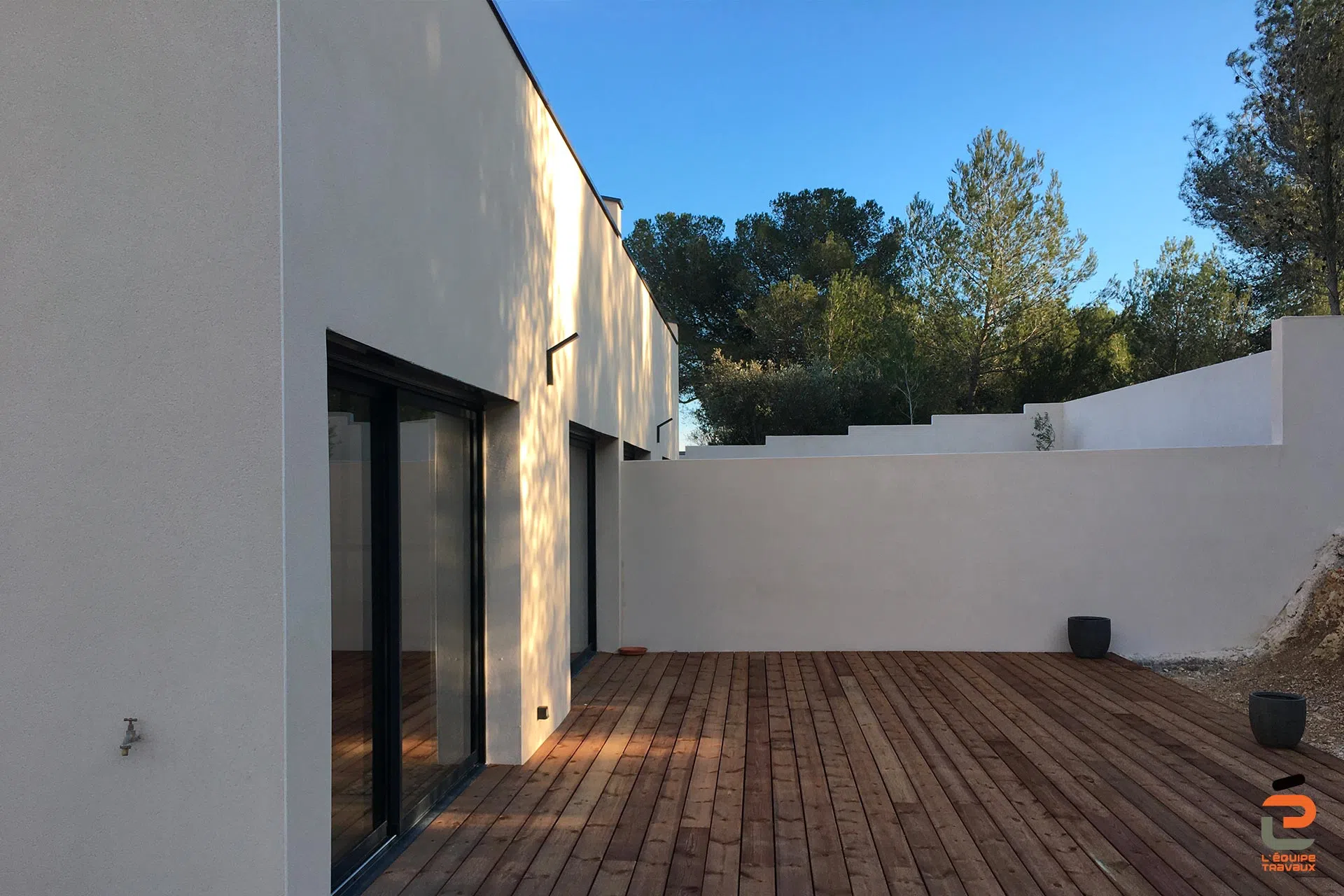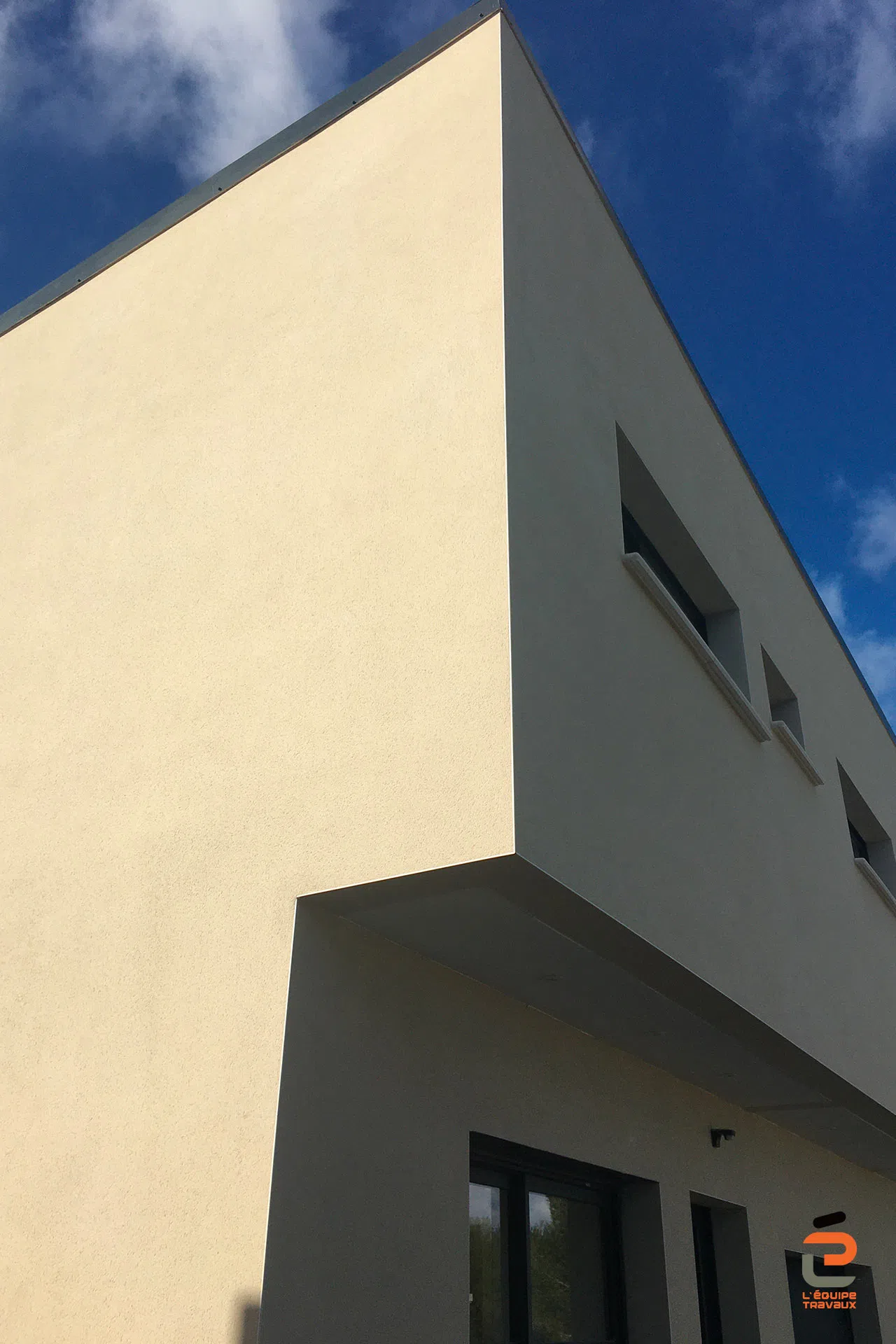 Cet ensemble immobilier dans la zone d’activité de Vergèze (La Montée Rouge) est composé d’un bâtiment de bureaux et d’un entrepôt destiné à héberger des entreprises artisanales. Ils ont tous deux été traités avec un enduit monocouche Monorex de la marque ParexLanko avec une finition dite gratté fin. Le client a opté pour une couleur proche de celle du sol calcaire du lieu (G20, blanc cassé) afin de créer un lien entre les bâtiments aux lignes architecturales sobres et le site naturel.