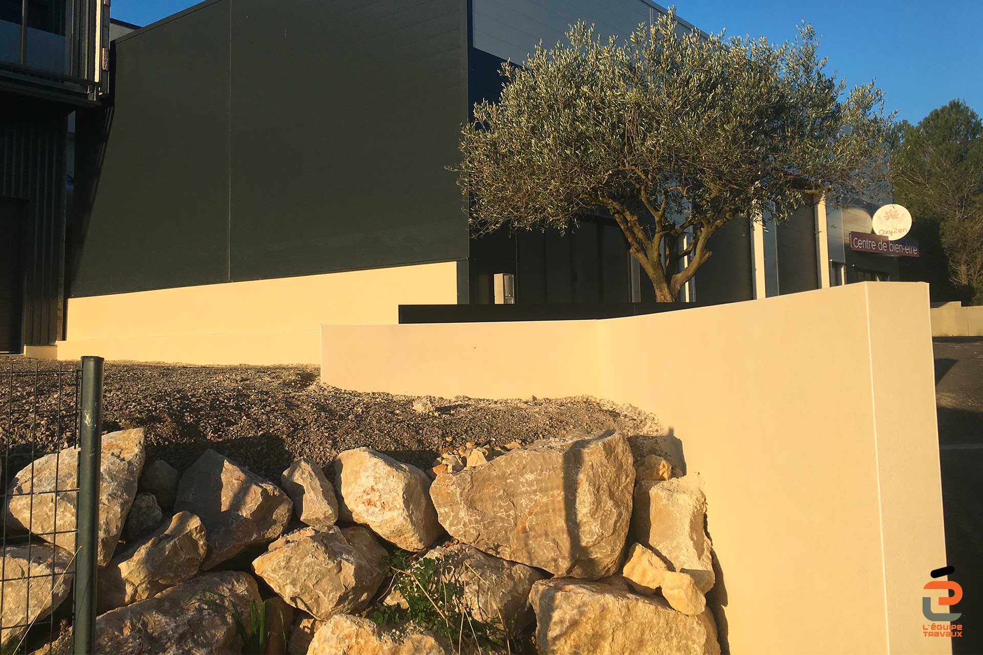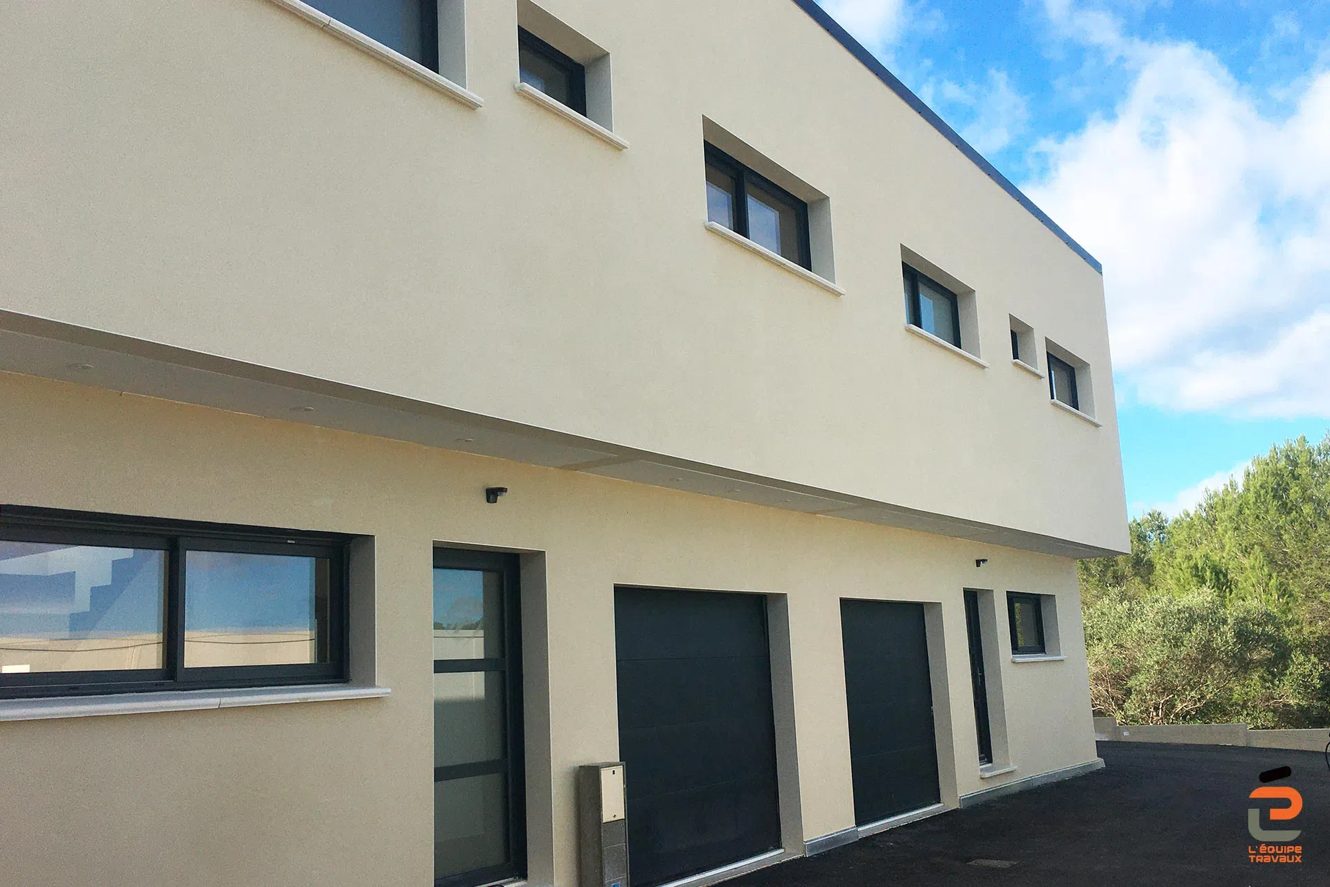 Cet ensemble immobilier dans la zone d’activité de Vergèze (La Montée Rouge) est composé d’un bâtiment de bureaux et d’un entrepôt destiné à héberger des entreprises artisanales. Ils ont tous deux été traités avec un enduit monocouche Monorex de la marque ParexLanko avec une finition dite gratté fin. Le client a opté pour une couleur proche de celle du sol calcaire du lieu (G20, blanc cassé) afin de créer un lien entre les bâtiments aux lignes architecturales sobres et le site naturel.